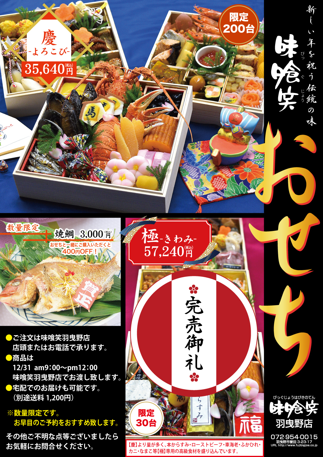「慶(よろこび)」よりも量が多く、本からすみ・ローストビーフ・車海老・ふかひれ・カニ・なまこ等の高級食材を盛り込みました。 まさに“極”と呼ぶに相応しい贅を凝らしたおせちです。
